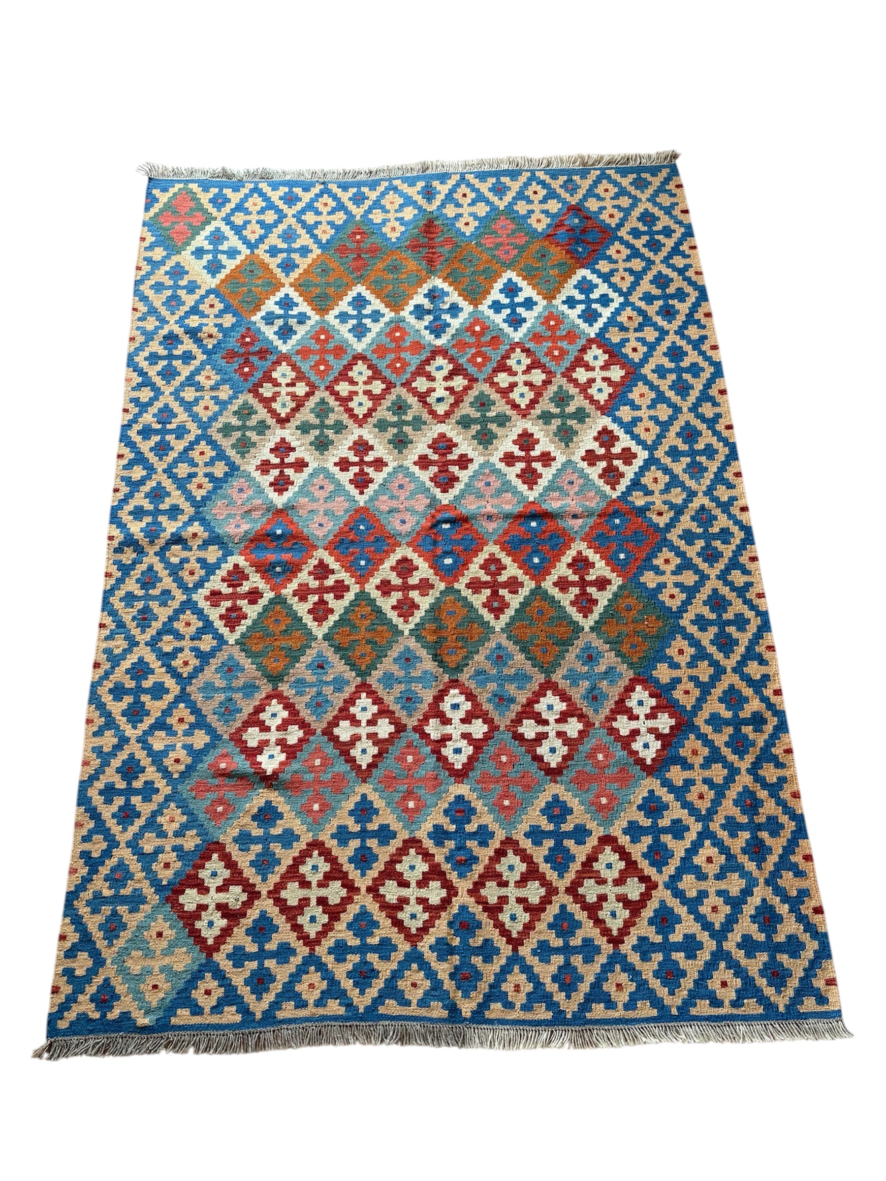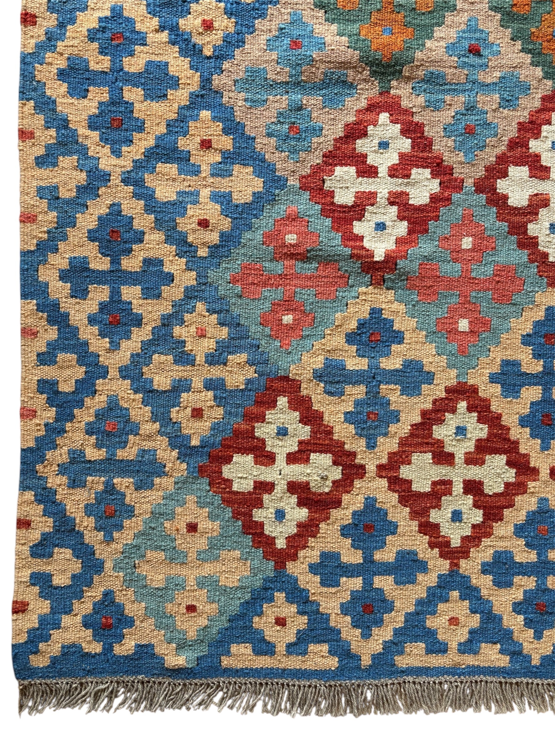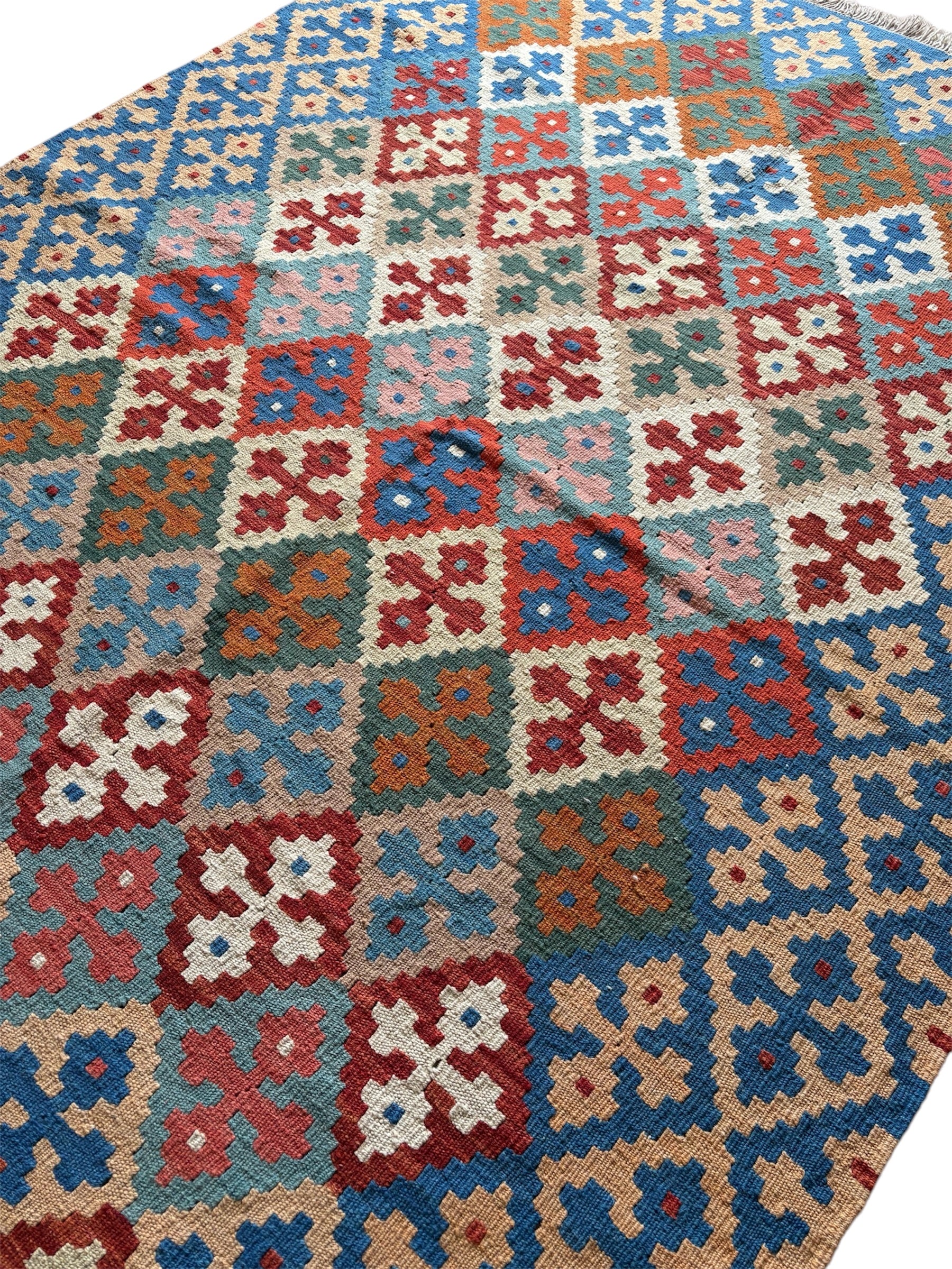 Beautiful hand woven Kilim. Made in Southwestern Persia, near Shiraz. These kilims have geometric designs and vibrant colours, using wool and herbal dyes.