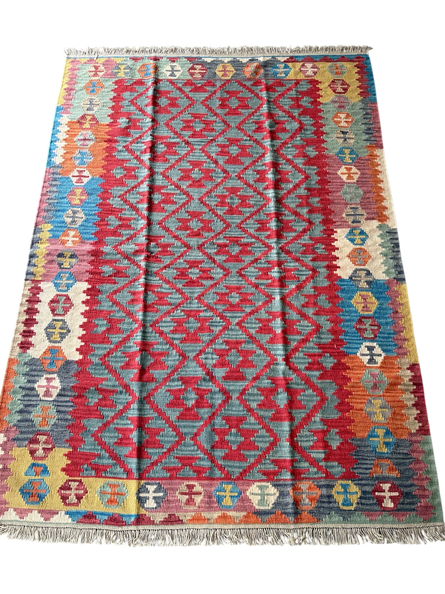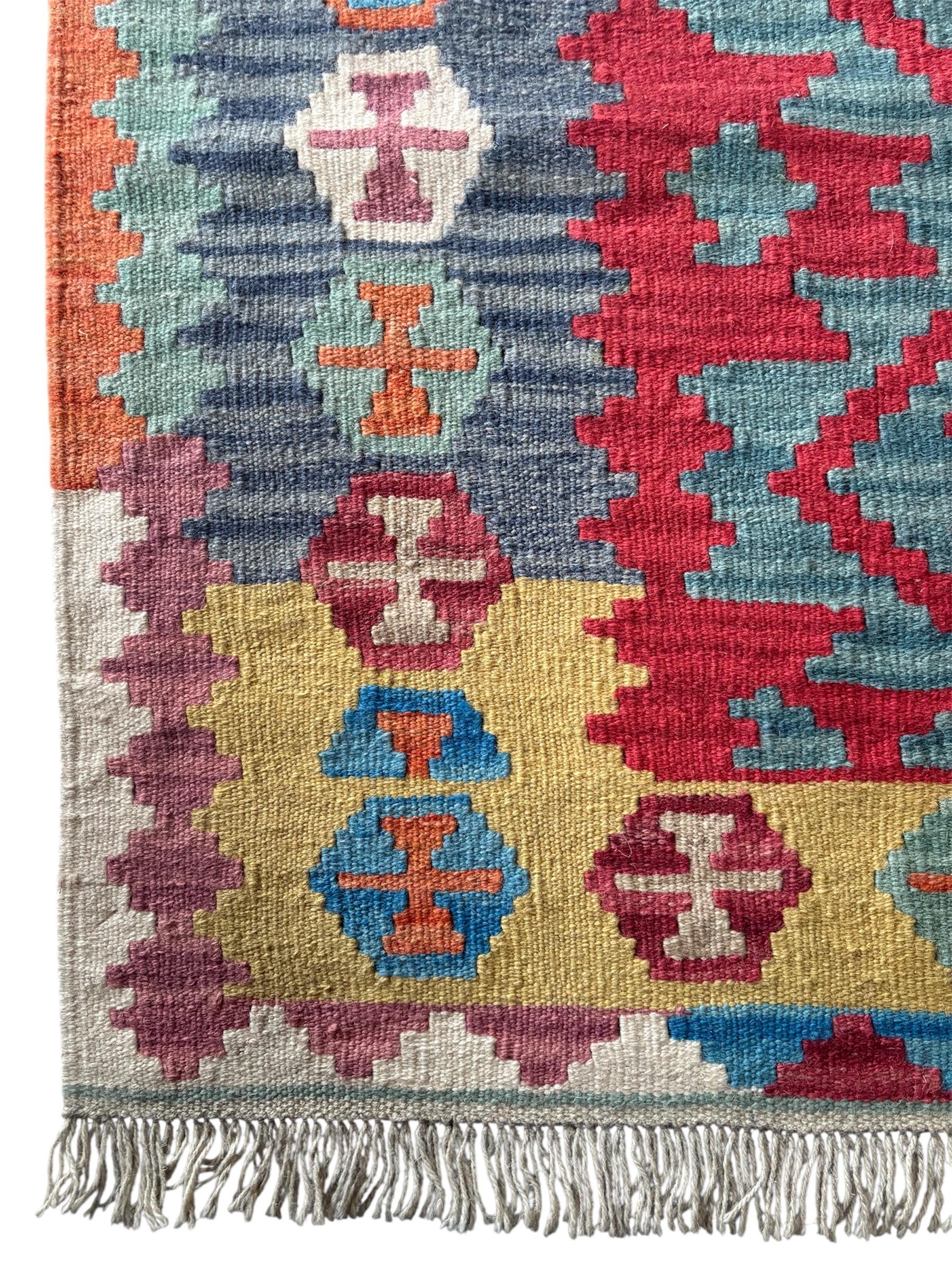 Beautiful hand woven Kilim. Made in Southwestern Persia, near Shiraz. These kilims have geometric designs and vibrant colours, using wool and herbal dyes.